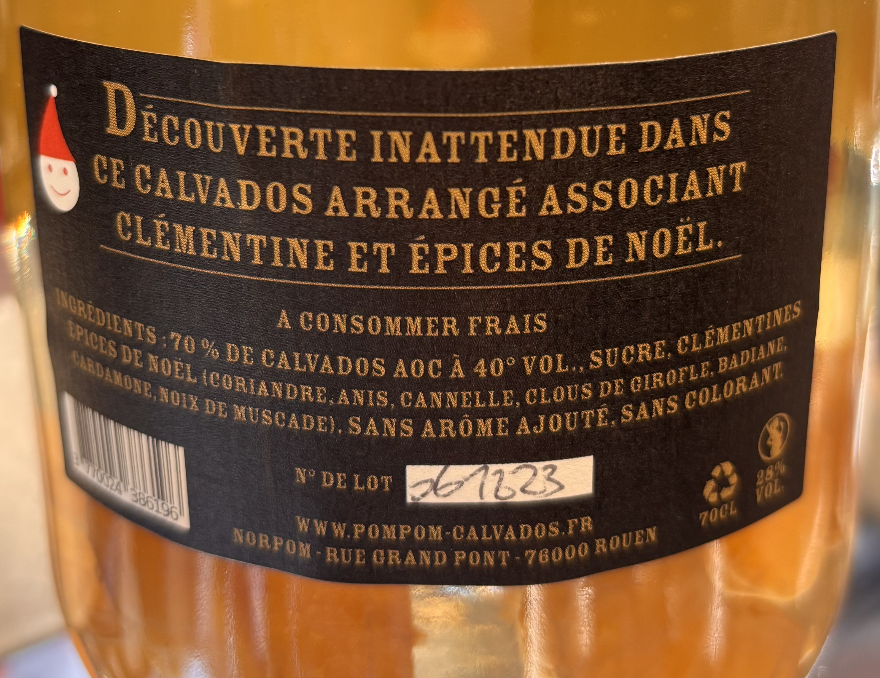 Ingrédients : 70% de Calvados à 40°vol, sucre, clémentines, épices de Noël (coriandre, anis, cannelle, clous de girofle, badiane, cardamome, noix de muscade) Sans arôme ajouté, sans colorant. A...